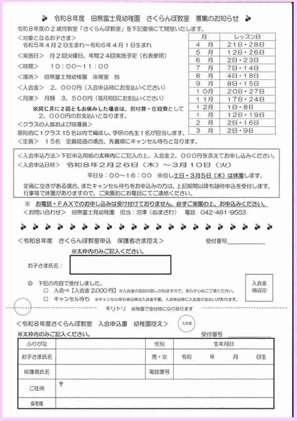 ● さくらんぼ教室 入会申込用紙・・・HPに提示、または幼稚園でもお配りしています。